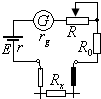 2、选择题 如图为多用表欧姆档的原理图,其中电流表的满偏电流为300μA,内rg=100Ω,调零电阻的最大阻值R=50kΩ,串联的固定电阻R0=50Ω,电池电动势E=1.5V.用它测量电阻Rx,能准确测量的范围是 ( )