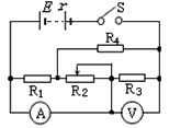 5、计算题 如图所示的电路中,当S闭合时,电压表和电流表(均为理想电表)的示数各为1.6 V和0.4 A。当S断开时,它们的示数各改变0.1 V和0.1 A,求电源的电动势和内电阻。