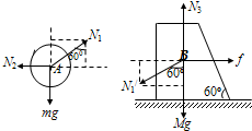 ![]() 参考答案:对物体受力分析,受重力、拉力、支持力和摩擦力,如图 本题解析: 本题难度:简单 2、简答题 质量m=15kg的光滑球A悬空靠在墙和木块B之间,木块B的质量为M=150kg,且静止在水平地板上,如图所示,取g=10m/s2,求: 参考答案:(1)小球A和木块B受力分析如图所示,用N1、N2、N3、N1′分别表示木块对A的弹力、墙壁对A的支持力、地面对木块的支持力以及球A对木块B的压力. 本题解析: 本题难度:一般 3、选择题 如图所示,物体放在倾斜木板上,当木板倾角θ为30°和45°时,物体受到的摩擦力的大小恰好相同,则物体和木板间的动摩擦因数最接近( ) |