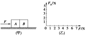 1、计算题 如图(甲)所示,完全相同的A、B两物体放在水平面上,与水平面间的动摩擦因数均为μ=0.2,每个物体重G=10N,设物体A、B与水平面间的最大静摩擦力均为Ffm=2.5N,若对A施加一个向右的由零均匀增大到6N的水平推力F,请将A所受到的摩擦力随水平推力F的变化情况在图(乙)中表示出来。(要求写出作图过程)