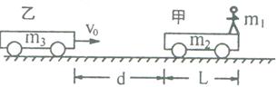 4、简答题 (18分)如图所示,质量为m1=50kg的某学生(可视为质点)站在长为L=3m、质量为m2=100kg的甲车右端,人和车均处于静止状态,地面水平光滑。一质量为m3=100kg的乙车以速度v0=3m/s向右运动。当该学生发现乙车时,两车距离为d=5m,该学生马上在家车商向左匀加速跑动,跑到甲车车位后从甲车跳到乙车上,假设该生跳到乙车后马上相对乙车静止。求: