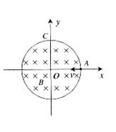 1、计算题 (10分)在以坐标原点 O为圆心、半径为 r的圆形区域内,存在磁感应强度大小为 B、方向垂直于纸面向里的匀强磁场,如图所示。 一个不计重力的带电粒子从磁场边界与 x轴的交点 A处以速度 v沿负x方向射入磁场,它恰好从磁场边界与 y轴的交点 C处沿正y方向飞出。