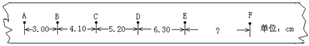 4、实验题 (8分)如图所示是某同学用打点计时器研究物体运动规律时得到的一条纸带,在纸带上确定出A、B、C、D、E、F共6个计数点,其相邻点间的距离如图所示。每两个相邻的计数点间的时间间隔为0.10s。则