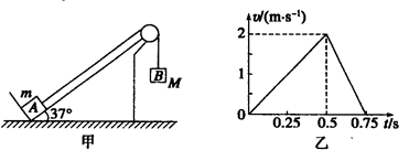 2、选择题 如图甲所示,一固定在地面上的足够长斜面,倾角为37°,物体A放在斜面底端挡板处,通过不可伸长的轻质绳跨过光滑轻质滑轮与物体B相连接,B的质量M=1kg,绳绷直时B离地面有一定高度。在t=0时刻,无初速度释放B,由固定在A上的速度传感器得到的数据绘出的A沿斜面向上运动的v-t图象如图乙所示,若B落地后不反弹,g取10 m/s2,sin37°=0.6,cos37°=0.8,则下列说法正确的是