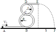 4、简答题  如图所示,两个圆形光滑细管在竖直平面内交叠,组成“8”字形通道,在“8”字形通道底端B处连接一内径相同的粗糙水平直管AB.已知E处距地面的高度h=3.2m,一质量m=1kg的小球a从A点以速度v0=12m/s的速度向右进入直管道,到达B点后沿“8”字形轨道向上运动,到达D点时恰好与轨道无作用力,直接进入DE管(DE管光滑),并与原来静止于E处的质量为M=4kg的小球b发生正碰(ab均可视为质点).已知碰撞后a球沿原路返回,速度大小为碰撞前速度大小的