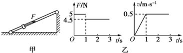 1、选择题 如图甲所示,足够长的固定光滑细杆与地面成一定倾角,在杆上套有一个光滑小环,沿杆方向给环施加一个拉力F,使环由静止开始运动,已知拉力F及小环速度v随时间t变化的规律如图乙所示,重力加速度g取10m/s2.则以下判断正确的是( )