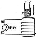 4、填空题  电流表指针偏转方向与电流流入方向的关系如图甲所示,现将此电流表与竖直放置的线圈连成乙图电路,并将磁铁从上方插入线圈,请在图乙的表头内画出磁铁插入线圈过程中指针的大体位置.