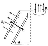 4、选择题 一个闭合回路由两部分组成,如图所示,右侧是电阻为r的圆形导线,置于竖直方向均匀变化的磁场B1中;左侧是光滑的倾角为θ的平行导轨,宽度为d,其电阻不计.磁感应强度为B2的匀强磁场垂直导轨平面向上,且只分布在左侧,一个质量为m、电阻为R的导体棒此时恰好能静止在导轨上,分析下述判断正确的有:( )
