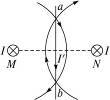 参考答案:磁铁水平放置时:穿过闭合回路的磁通量为零; 本题解析: 本题难度:简单 2、选择题  如图所示,在光滑水平面上一轻质弹簧将挡板和一条形磁铁连接起来,此时磁铁对水平面压力大小为N1,现在磁铁左上方位置固定一导体棒,当导体棒中通以垂直纸面向里的电流后,磁铁对水平面压力大小为N2 ,则以下说法正确的是(?) 参考答案:AD 本题解析:因为地面光滑,所以开始时弹簧处于原长状态.以导体棒为研究对象,根据左手定则判断可知,其所受安培力方向为斜向右下方,根据牛顿第三定律得知,磁铁受到的安培力方向斜向左上方,则磁铁将向左运动,弹簧被压缩,长度将变短.故选项A正确B错误;由于磁铁受到的安培力方向斜向左上方,对地面的压力减小,则 本题难度:一般 3、选择题  如图7所示,通电直导线ab位于两平行导线横截面MN的连线的中垂线上,当平行导线通以同向等值电流时,以下说法中正确的是(?) 参考答案:C 本题解析:首先分析出两个平行电流在直线电流ab处产生的磁场情况,如图所示,两电流产生的、在直线电流ab上部分的磁感线方向都是从左向右,则ab上部分电流受到的安培力方向垂直纸面向外;ab下部分处的磁感线方向都是从右向左,故ab下部分电流受到的安培力方向垂直纸面向里.所以,导线的a端向外转动,导线的b端向里转动. 本题难度:一般 4、简答题  磁场中放一与磁场方向垂直的电流元,通入的电流是2.5A,导线长1cm,它受到的安培力为5×10-2N.问: 参考答案:(1)磁感应强度的大小为:B=FIL=0.052.5×0.01T=2T 本题解析: 本题难度:一般 5、填空题  如图所示,长为L=0.1 m、质量m=0.1 kg的金属棒PQ,用导线悬挂在竖直向上的匀强磁场中,当导线中的电流强度I=10 A时,悬线偏离竖直方向37°而平衡,则该磁场的磁感应强度的大小为_________T,导线中的电流方向为_________。 参考答案:0.75,P→Q 本题解析: 本题难度:一般 |