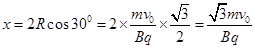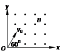 5、计算题 如图所示,在图中第1象限范围内有垂直xy平面的匀强磁场,磁感应强度为B,质量为m、电量为q的正离子从O点沿xy平面射入磁场中,速度为v0,方向与x轴夹角θ=60°,不计粒子重力。求: