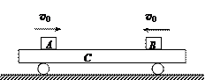 2、简答题 (20分)如图所示,质量为m3的平板车C放在光滑水平面上,车上放有A、B两小滑块,质量分别是m1、m2,与平板车上表面间动摩擦因数分别为μ1和μ2。同时分别给A、B一个冲量使它们都获得相同大小的初速度v 0开始相向运动,A、B恰好不相碰。已知m1=10 kg,m2=2 kg,m3=6 kg,?μ1=0.1,μ2=0.2,?v0=9 m / s。g取10 m /s2。求: