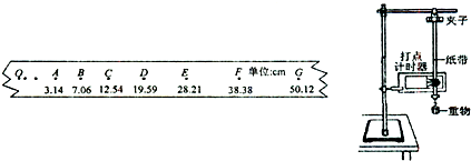 (2)实验中打下的一条纸带,O点是重物开始下落时打下的起点,该小组在纸带上选取A、B、C、D、E、F、G七个计数点,每两个计数点间还有一个计时点(图中未画出),各计数点与起点O的距离如图所示,已知打点计时器工作频率为50Hz,分别计算B、C、D、E、F五个计数点,则当地的重力加速度为______(结果保留3位有效数字).