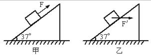 5、计算题 如图甲所示,一固定的粗糙斜面的倾角为37°,一物块m=5kg在斜面上,若用F=50N的力沿斜面向上推物块,物块能沿斜面匀速上升,g=10m/s2,sin37°=0.6,cos37°=0.8.