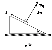 本题解析:对滑动进行受力分析,滑块一定受重力,电场力,此二力不可能平衡,故滑块一定受到斜面的摩擦力,有摩擦力则斜面必给滑块一个弹力,如图所示,