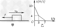 3、选择题 如图甲所示,质量为m=0.5kg,初速度v0=10 m/s的物体,受到一个与初速度v0方向相反的外力F作用,沿粗糙的水平面滑动,物体与地面间的动摩擦因数为μ,经3 s后撤去外力,直到物体停止。整个过程物体的v-t图像如图乙所示(g=10m/s2)。则