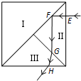 2、选择题 如图所示,有三块截面为等腰直角三角形的透明材料(图中的Ⅰ、Ⅱ、Ⅲ)恰好拼成一个正方形棱镜.从E点垂直于边射入的单色光在F处发生全反射,在G、H连续发生两次折射后射出.若该单色光在三块材料中的传播速率依次为v1、v2、v3,下列关系式中正确的是( ) A.v3>v1>v2 B.v2>v3>v1 C.v3>v2>v1 D.v1>v2>v3