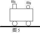 5、选择题 如图5所示,在上表面光滑的小车上放有质量m1的物块和质量为m2的小球,且m1>m2,开始时物块,小车.小球一起在水平面上匀速运动,现让小车向右匀加速运动则?(?)