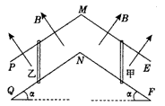 3、计算题 如图所示,两条“∧”形足够长的光滑金属导轨PME和QNF平行放置,两导轨间距L=1 m,导轨两侧均与水平面夹角α=37°,导体棒甲、乙分别放于MN两边导轨上,且与导轨垂直并接触良好。两导体棒的质量均为m=0.1 kg,电阻也均为R=1 Ω,导轨电阻不计,MN 两边分别存在垂直导轨平面向上的匀强磁场,磁感应强度大小均为B=1 T。设导体棒甲、乙只在MN两边各自的导轨上运动,sin37°=0.6,cos37°=0.8,g取10 m/s2。
