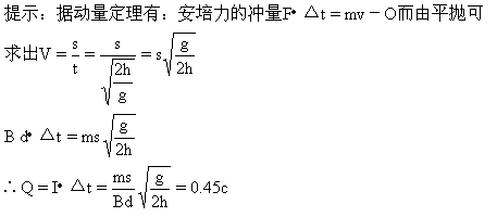 4、简答题 如图,相距d=10cm水平放置在高h处的两根导电轨道,轨道间接有电源,处于磁感强度B=0.1T、垂直轨道平面向上的匀强磁场中.K断开时,将一根质量m=3g的金属杆放于轨道一边缘处,然后闭合K,金属杆沿水平方向飞出落于地面上,其水平距离s=1.5m.h=5m,则闭合K时通过金属杆的电量为多少?