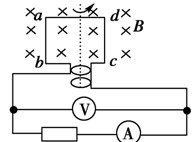 5、计算题 如图所示,线圈abcd的面积是0.05m2,共100匝,线圈电阻忽略不计,外接电阻R=10Ω,匀强磁场的磁感应强度为B=