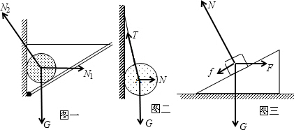 (a)物体受到重力G、墙面的支持力N1、挡板的支持力N2三个力的作用,如图一所示.