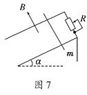 4、选择题 如图7所示,有两根和水平方向成α角的光滑平行的金属轨道,上端接有可变电阻R,下端足够长,空间有垂直于轨道平面的匀强磁场,磁感应强度为B.一根质量为m的金属杆从轨道上由静止滑下,经过足够长的时间后,金属杆的速度会趋近于一个最大速度vm,则 ( )