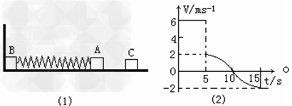 如图(1)所示,物体A、B的质量分别是4kg和8kg,由轻弹簧连接,静止放在光滑的水平面上,物体B左侧与竖直墙壁相接触。另有一个物体C水平向左运动,在t=5s时与物体A相碰,并立即与A有相同的速度,一起向左运动,物块C的速度-时间图象如图(2)所示。?