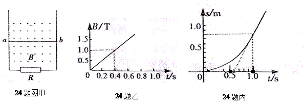 4、简答题 如图甲所示,两根足够长的竖直光滑平行金属导轨相距为L1=0.1m,导轨下端通过导线连接阻值R=0.4Ω的电阻。质量为m=0.2kg、阻值r=0.1Ω的金属棒ab放在两导轨上,棒与导轨垂直并保持良好接触,整个装置处于垂直导轨平面向外的磁场中,取g=10m/s2.