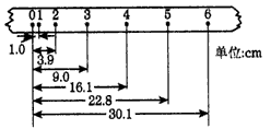 3、计算题 如图是条利用打点计时器打出的纸带,0、1、2、3、4、5、6是七个计数点,每相邻两个计数点之间还有四个点未画出,各计数点到0的距离如图所示。求出1、2、3、4、5计数点的瞬时速度并画出速度一时间图象。