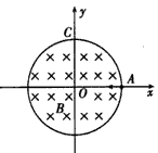5、计算题  在以坐标原点O为圆心、半径为r的圆形区域内,存在磁感应强度大小为B、方向垂直于纸面向里的匀强磁场,如图所示。一个不计重力的带电粒子从磁场边界与x轴的交点A处以速度v沿-x方向射入磁场,它恰好从磁场边界与y轴的交点C处沿+y,方向飞出。