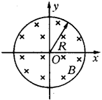 1、计算题  如图所示,在xOy平面上,一个以原点O为中心、半径为R的圆形区域内存在着一匀强磁场,磁场的磁感应强度为B,方向垂直于xOy平面向内。在O处原来静止着一个具有放射性的原子核 (氮),某时刻该核发生衰变,放出一个正电子和一个反冲核。已知正电子从O点射出时沿小x轴正方向,而反冲核刚好不会离开磁场区域,正电子电荷量为e。不计重力影响和粒子间的相互作用。