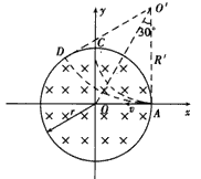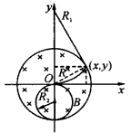 1、计算题 如图所示,在xOy平面上,一个以原点O为中心、半径为R的圆形区域内存在着一匀强磁场,磁场的磁感应强度为B,方向垂直于xOy平面向内。在O处原来静止着一个具有放射性的原子核
