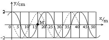 4、简答题 简谐波沿x轴传播,波速为50m/s.t=0时的波形如图,M处的质点此时正经过平衡位置沿y轴正方向运动.画出t=0.5s时的波形图.(请用虚线作图)