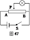 1、简答题 变阻器的总电阻RAB=30Ω,电源电动势E=12V,内阻很小可不计。现有一个标有“6V,1.8W”的灯泡采用如图47所示的分压电路。要使灯泡正常发光,则应将变阻器的滑动触头P调整到使PB间的电阻R等于多少?