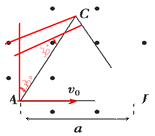 本题解析:电子为负电荷,速度沿AB方向,磁场垂直纸面向里,判断洛伦兹力竖直向上,即指向圆周运动的圆心。如图所示,ABC为等边三角形,几何关系如图,圆周运动的轨迹和BC边的切点只可能是C点,此时,圆周运动半径为