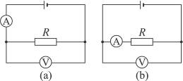 4、简答题 利用伏安法测电阻R的值,当按图(a)电流表外接时,电表读数分别为I1="2.1" A,U1="45.8" V;当按图(b)电流表内接时电表读数分别为I2="2" A,U2="50" V.求电阻R的实际阻值.(电源内阻很小,可忽略不计)