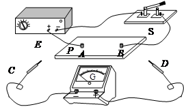 3、实验题 如图所示,E为直流电源,G为灵敏电流计,A、B为两个圆柱形电极,P是木板,C、D为两个探针,S为开关。现用上述实验器材进行“用描迹法画出电场中平面上的等势线”的实验。