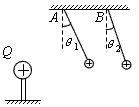 1、选择题 如图所示,Q是放在绝缘柄上的带正电的物体,把一个系在绝缘丝线上的带正电的小球,先后挂在图中的A、B两个位置,小球两次平衡时,丝线偏离竖直方向的夹角分别为θ1、θ2,则θ1和θ2的关系是
