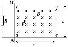 1、计算题 (18分)如图所示,光滑的平行金属导轨水平放置,电阻不计,导轨间距为l,左侧接一阻值为R的电阻.区域cdef内存在垂直轨道平面向下的有界匀强磁场,磁场宽度为s.一质量为m、电阻为r的金属棒MN置于导轨上,与导轨垂直且接触良好,受到F=0.5v+0.4(N)(v为金属棒速度)的水平外力作用,从磁场的左边界由静止开始运动,测得电阻两端电压随时间均匀增大.(已知:l="1" m,m="1" kg,R="0.3" Ω,r="0.2" Ω,s="1" m)