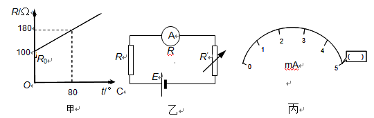 (1)如图(甲)是由某金属材料制成的电阻R随摄氏温度t变化的图像,若用该电阻与电池(电动势E=1.5V,内阻不计)、电流表(量程为5mA、内阻不计)、电阻箱R′ 串联起来,连接成如图(乙)所示的电路,用该电阻做测温探头,把电流表的电流刻度改为相应的温度刻度,就得到了一个简单的“金属电阻温度计”。