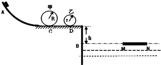 2、简答题  如图所示是某公园中的一项游乐设施,半径为R=手.5m、r=4.5m的两圆形轨道甲和乙安装在同一竖直平面内,两轨道之间由 一条水平轨道CD相连,现让可视为质点的质量为40图g的无动力小滑车从A点由静止释放,刚好可以滑过甲轨道后经过CD段又滑手乙轨道后离开两圆形轨道,然后从水平轨道飞入水池内,水面离水平轨道的高度h=5m,所有轨道均光滑,g=40m/s手.