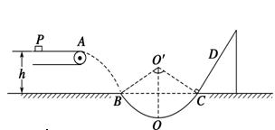 2、计算题 如图所示,水平传送带以5m/s的速度沿顺时针方向运动,在传送带上的P点轻轻地放上一质量m=1 kg的小物块,PA间的距离为1.5m,小物块随传送带运动到A点后水平抛出,恰好沿圆弧切线从B点进入竖直光滑圆弧轨道运动。B、C为圆弧的两端点其连线水平,CD为与C点相切的一固定斜面。小物块离开C点后经0.8 s通过D点。已知小物块与传送带间的动摩擦因数μ1=0.3,圆弧轨道最低点为O,A点与水平面的高度差h=0.8 m,小物块与斜面间的动摩擦因数μ2=
