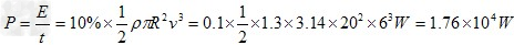 4、计算题 某地区的平均风速是6m/s ,已知空气密度为1.3 kg/m3,此地有一风车,其叶片转动可形成一个半径为20m 的圆面,假如这个风车能将此圆内10% 的气流动能转化为电能,求这个风车发电的功率.