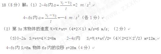 参考答案:(1)2~4s内,4~6s内加速度分别为2m/s2和-4 m/s2。 (2)6m/s (3)28m
