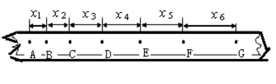 1、填空题  在做“研究匀变速直线运动”的实验时,得到一条纸带如图所示,A、B、C、D、E、F、G为计数点,每两个计数点间还有4个点未画出,x1 ="1.20cm," x 2 ="1.60cm," x 3 ="1.98cm," x 4 =2.38cm,  x 5 =2.79cm,  x 6 =3.18cm