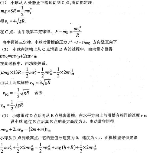 ( l )当小球从B 点切人滑槽到达左侧圆弧面端点C 时,小球对滑槽的压力是多少。 ( 2 )当小球从C 点刚滑到D 点时,小球的速度大小是多少。 ( 3 )小球通过右端圆弧顶点E 后,离E的最大高度是多少。