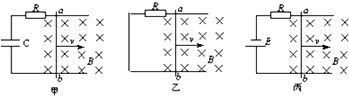2、选择题 在如甲、乙、丙三图中,除导体棒ab可动外,其余部分均固定不动,甲图中的电容器C原来不带电,丙图中的直流电源电动势为E,除电阻R外,导体棒、导轨和直流电源的电阻均可忽略,导体棒和导轨间的摩擦也不计.图中装置均在水平面内,且都处于方向垂直水平面(即纸面)向下的匀强磁场中,导轨足够长.今给导体棒ab一个向右的相同初速度v0,以下说法正确的是( ) A.在导体棒刚开始运动时,甲、乙、丙三种情况中通过电阻R的电流相同 B.三种情形下导体棒ab最终都将静止 C.最终只有乙中导体棒ab静止,甲、丙中导体棒ab都将作匀速直线运动 D.在导体棒ab运动的全部过程中,三个电阻R产生的热量大小是Q甲>Q乙>Q丙