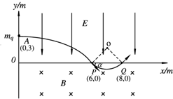 ![]() 参考答案:AC 本题解析: 本题难度:简单 3、简答题 如图所示,在直角坐标系xoy的第一象限中分布着沿y轴负方向的匀强电场,在第四象限中分布着方向向里垂直纸面的匀强磁场.一个质量为m、带电+q的微粒,在A点(0,3)以初速度v0=120m/s平行x轴射入电场区域,然后从电场区域进入磁场,又从磁场进入电场,并且先后只通过x轴上的p点(6,0)和Q点(8,0)各一次.已知该微粒的比荷为