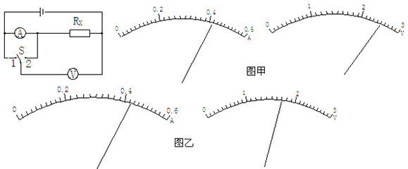 ②当开关S与2相连时,伏特表、安培表示数如下图中乙所示,则伏特表示数为 ,安培表示数为 。