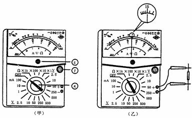 5、实验题 图甲为多用表的示意图,其中S、K、T为三个可调节的部件,现用此电表测量一阻值约为30